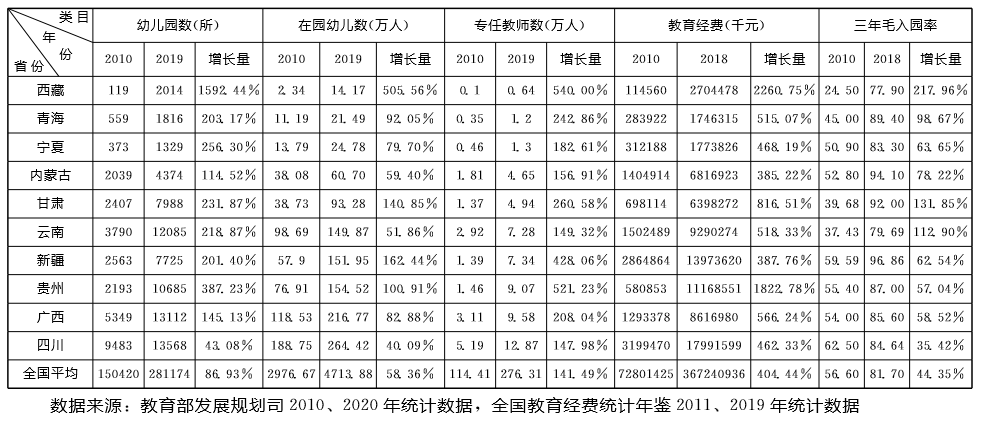 2010年以来,我国西部民族地区学前教育迅猛发展,资源增量取得了历史性突破(见表1)。