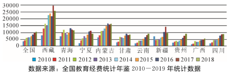 图1 2010-2018年全国和西部民族地区十省区生均学前教育经费支出(元)