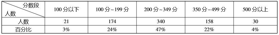 学生学业成绩作为一种结果性的呈现,反映了学生通过学习后所发生的阶段性变化,是衡量学校教育质量以及是否达成国家课程标准的重要表征。在调研期间,对Z中学初一年级期中考试成绩进行了分析,结果如表3所示。Z中学初一年级各学科采取的分数制为藏文、语文、数学、英语、历史、地理、生物等各科满分各100分。由表3可知,大部分学生的成绩集中在100分~349分之间,占总人数的71%,500分以上的只占4%,可见Z中学学生成绩普遍偏低。
