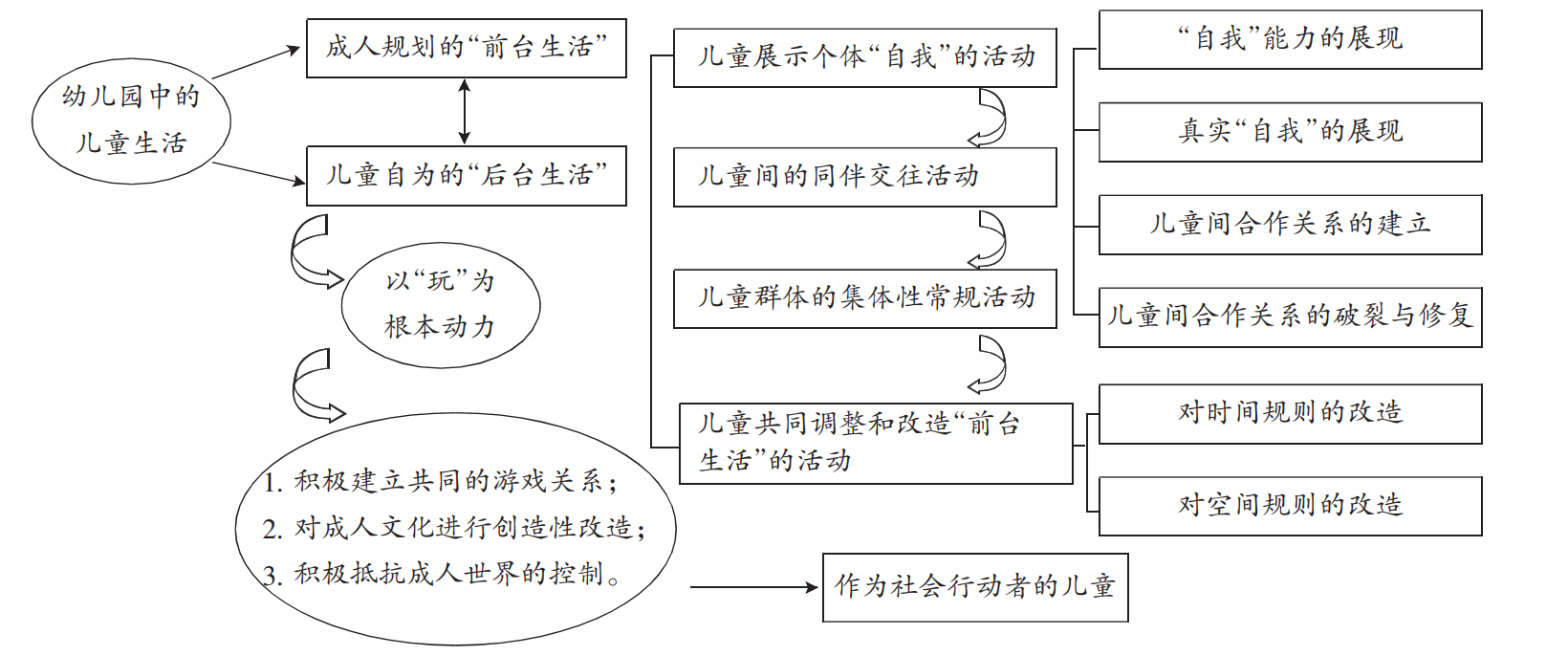 布约克沃尔德曾指出:“3岁左右,孩子们就很认真地进入与其他孩子一起玩耍的活动之中”。[36]与其他孩子一起玩耍的过程,为儿童扩展出一个更为广阔的天地。对于幼儿来说,开展“后台生活”的根本动力是“玩”。他们为了“玩”一起分享协作,为了“玩”彼此争吵辩论,又在“玩”中化解矛盾。“玩”成为儿童“后台生活”的核心主题,并且对于孩子来说,“玩”没有直接的目标指向,他们更重视在“玩”的过程中获得的快乐体验。可见,“玩”是儿童开展“后台生活”的根本动力。儿童通过分享协商、冲突对抗、调整成人设定的规则、创造集体性的自发游戏,不断在成人控制的时空下制造“玩”的机会,充分展现了儿童身为儿童的天性。