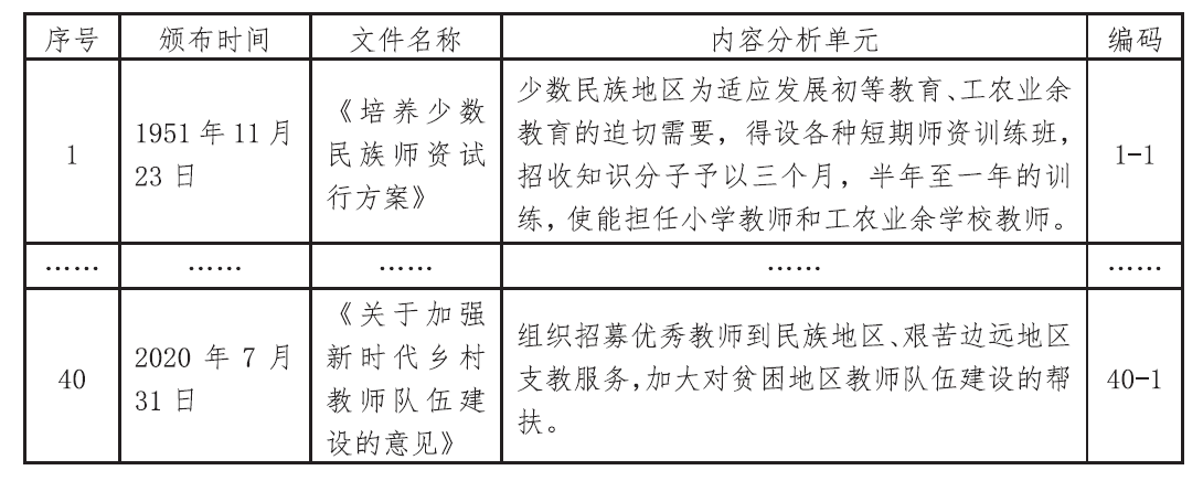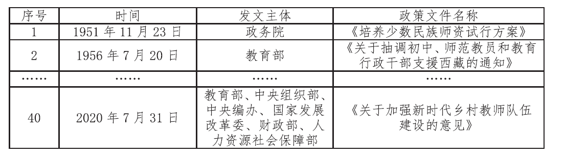 从1949年10月到2020年7月,中共中央、国务院等先后颁布近50份政策文件,经仔细阅读、谨慎筛选,确定其中40份与少数民族教师队伍建设高度相关,并将其列为研究对象(参见表1)。