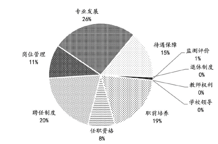 十个维度包括三类,第一类是涉及较多的“专业发展”、“聘任制度”、“职前培养”,频次分别为25、19、18,占比依次为26%、20%、19%。第二类是涉及较少的“待遇保障”、“岗位管理”、“任职资格”,频次分别为14、10、8,占比依次为15%、11%、8%。第三类是非常少甚至没有涉及的“监测评价”、“退休制度”、“教师权利”和“学校领导”。