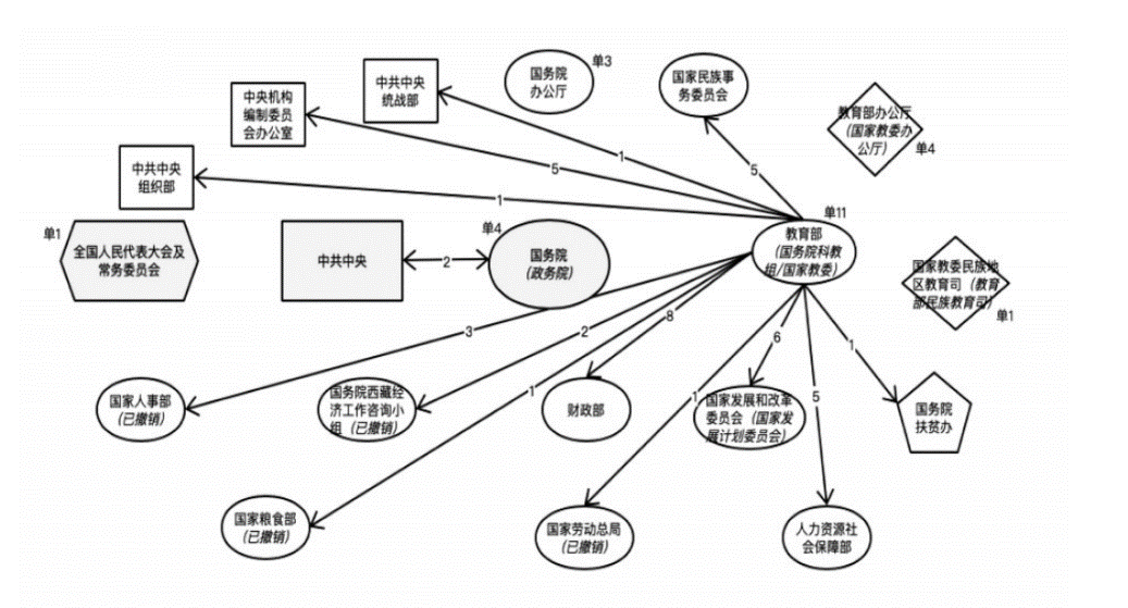 为明晰少数民族教师政策发文机构之间的关系,我们对40份政策文件的发文机构进行了逻辑关联分析(参见图1)。从图1可见,制定政策文件的主体共涉及19个单位。从发文机构的级别看,既有国家最高级的中共中央、全国人大、国务院,也有部委级单位,如教育部、财政部、国家民族事务委员会、国家发展和改革委员会、组织部、统战部等等,亦有部委下属机构,如教育部办公厅、民族教育司等。