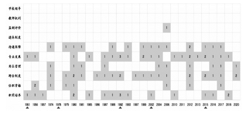 通过对70年来少数民族教师政策的发文机构、具体内容和颁布年份进行梳理,尝试用直观图示呈现教师政策的变化趋势,有利于宏观把握少数民族教师政策的发展脉络。