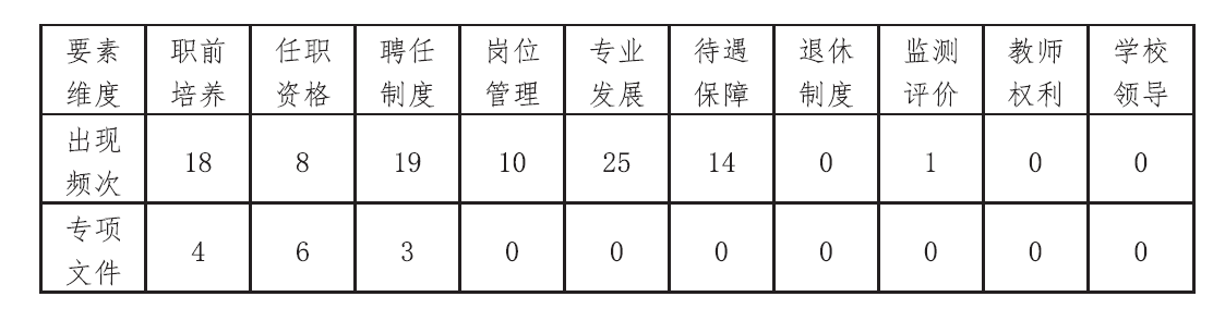 值得注意的是,在40份研究样本中,任职资格、职前培养、聘任制度的专项文件分别有6、4、3份,如《关于解决各地民族学院师资问题的意见》(1957)等四份文件仅涉及职前培养要素。