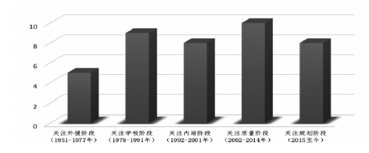 自1951年起,我国少数民族教师政策经过了关注外援、关注学校、关注内培、关注质量和关注规划等五个阶段的发展历程,各阶段的发文数量参见图4所示。