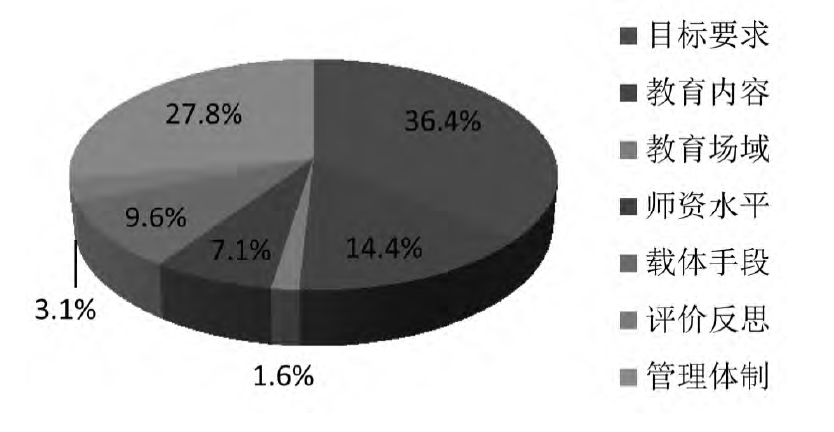 目标要求是一定时期内开展民族教育活动所要完成的任务和实现的预期效果,是教育者和管理者主观意愿的反映,也体现了民族教育的发展方向;教育内容是在民族教育过程中向受教育者讲授的思想和观点、传授的知识与技能以及培养的行为习惯等,具体形式如教材、课程等;教育场域是指民族教育主客体所处的特定场所及其相互之间所形成的客观关系网络,开发利用教育场域可以使民族教育内容从内化走向外化,有助于提高民族教育质量;教师是民族教育活动的具体承担者和实施者,负责引导受教育者向政策所要求的方向发展,因此师资水平在民族教育具体实施过程中发挥着主导作用;载体手段是指在实施民族教育活动的过程中,能够承载传递民族教育内容并为教育者所运用的各种形式与条件的总和,包括实施民族教育活动的装备设施、技术信息等;评价反思是指针对民族教育任务的完成情况进行衡量,并对实施效果进行研究探讨,从而实现对民族教育活动的动态调控;管理体制则体现了政府部门对民族教育的领导权责、政策支持以及各类学校对民族教育活动的管理。