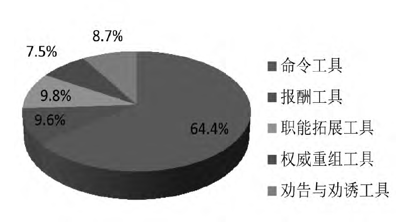 图1显示了民族教育各类政策工具总的占比情况,可以看出,在全部政策工具中,命令工具占比为64.4%,运用频率最高;报酬工具和职能拓展工具占比分别为9.6%和9.8%,使用频率相差不大;劝告与劝诱工具以及权威重组工具运用频率相对较低,占比分别为8.7%和7.5%。这说明长期以来,国家主要使用命令这一政策工具来改革与发展民族教育,希望通过自上而下的压力传导和责任落实来迅速推动民族教育的健康、可持续发展。