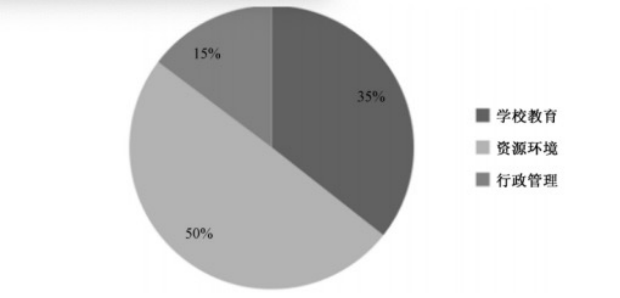 整体层面上,1987—2018年,《工作要点》对民族教育的总体关注度呈现增长趋势,2014年更是达到最高峰值。但就具体内容而言,不同时期民族教育关注的侧重点并不一致。一方面是横向上,民族教育政策在内容上虽集中关注学校教育、资源环境和行政管理等方面问题,但比重差异较大(如图2),可以看出民族教育的政策讨论主要集中在资源环境方面,占比达到了50%,其次是学校教育方面,占比达到了35%,占比最少的是行政管理方面,只有15%。另一方面是纵向上,民族教育政策内容上的演进具有阶段性特征,不同时期政策着力点有较大区别,从早期民族教育政策着力于外界帮扶和资源倾斜,逐渐演变为提升民族地区自我教育发展能力为主的政策诉求,关于这一点,我们下面会进一步讨论。