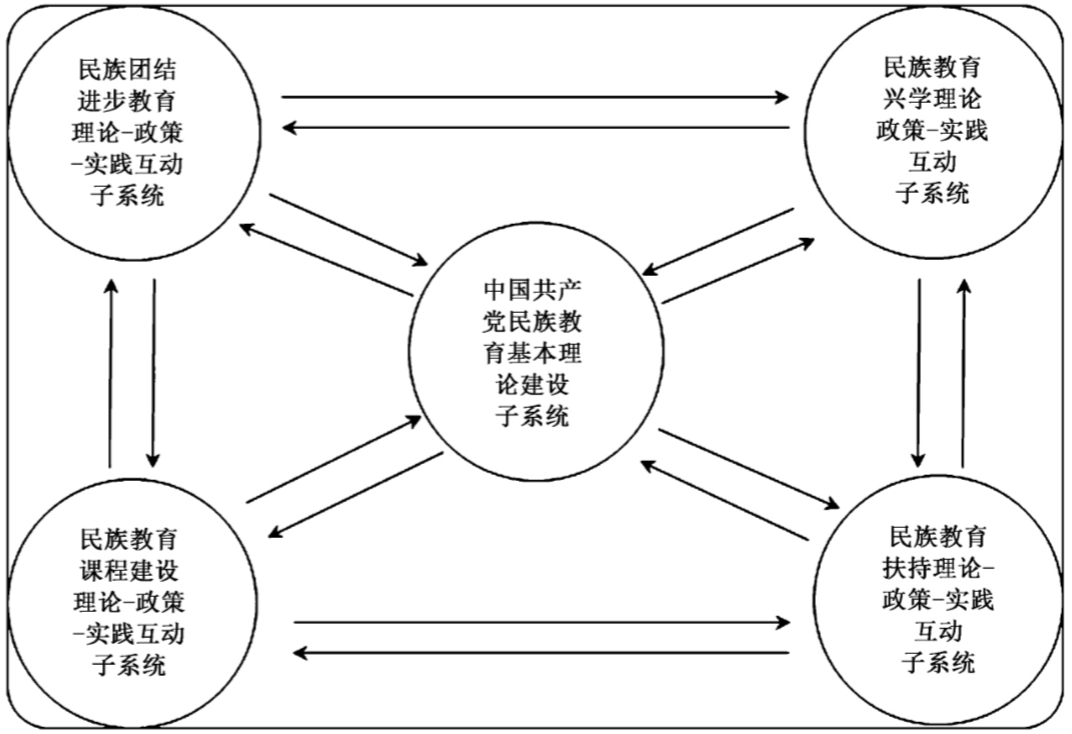 上述五个子系统是“一核多元一体”的关系,共同组成母系统——中国共产党民族教育理论—政策—实践互动机制。