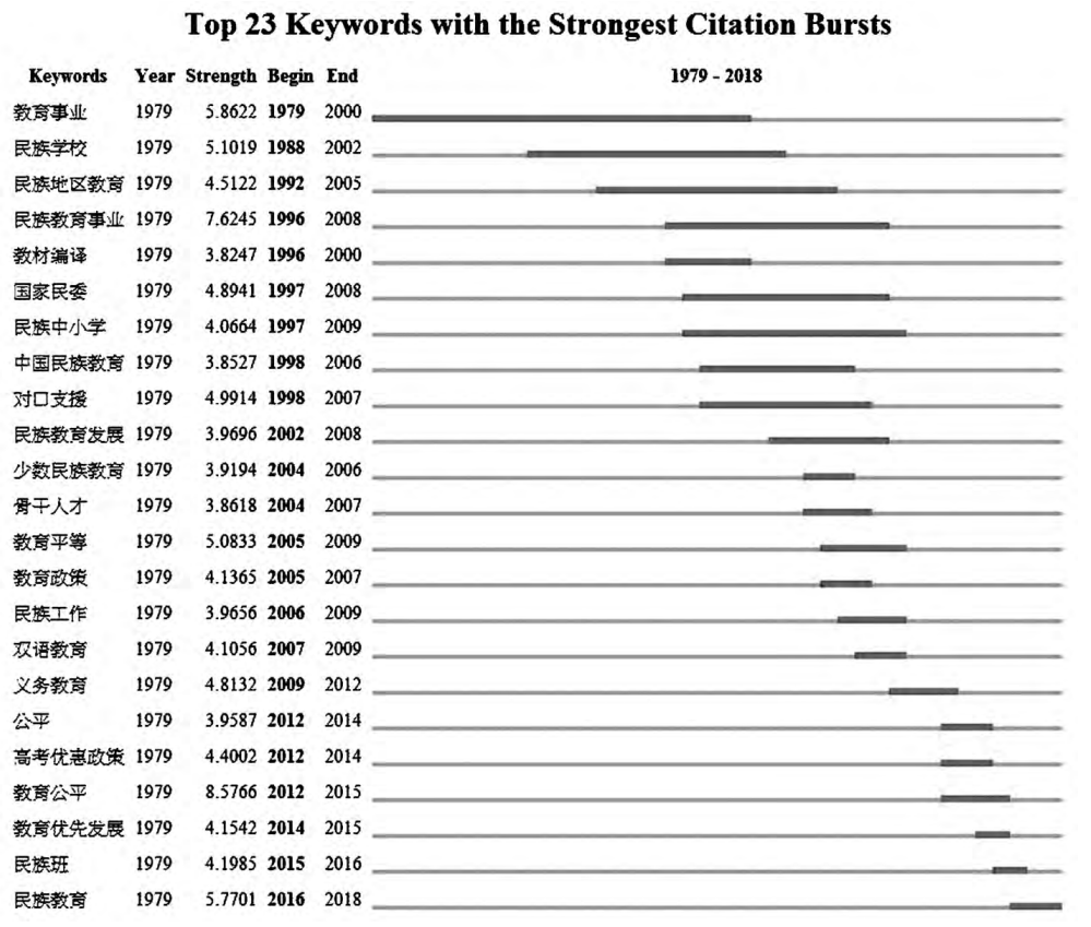 通过对民族教育政策研究文献进行突现词检测,得到23个突变词,如图3所示。图3中的深色加粗部分代表在相应的年份出现了使用频率激增的突现词,如“教育事业”这一词汇在1979—2000期间,一直是民族教育政策研究领域出现频率非常高的词汇,“民族班”是2015—2016年出现频率突增的词汇。某一段时间内使用频率激增的词汇就是这个时间段的研究热点。突现词随着时间的差异性变化与我国民族教育政策的出台和实施是密不可分的。以对口支援为例,1997年,全国对口首次援疆工作拉开了序幕,对口支援工作进入发展期。与此项政策相对应的,在民族教育政策研究领域,“对口支援”成为从1998年到2007年的突现词。结合图中关键词初现时间和突现的起始时间两个因素,可以得出2012年以来我国民族教育政策研究主要围绕“教育公平”“高考优惠政策”“教育优先发展战略”“民族班政策”等热点展开。