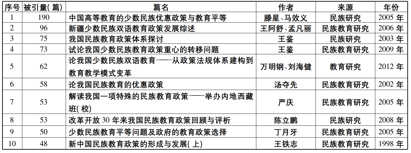 民族教育政策研究领域被引量最高的前10篇文献如表2所示。从表2可以看出,高被引文献主要围绕少数民族优惠政策、双语教育政策、民族教育政策体系及发展脉络、教育平等、内地西藏班(校)等主题展开研究。