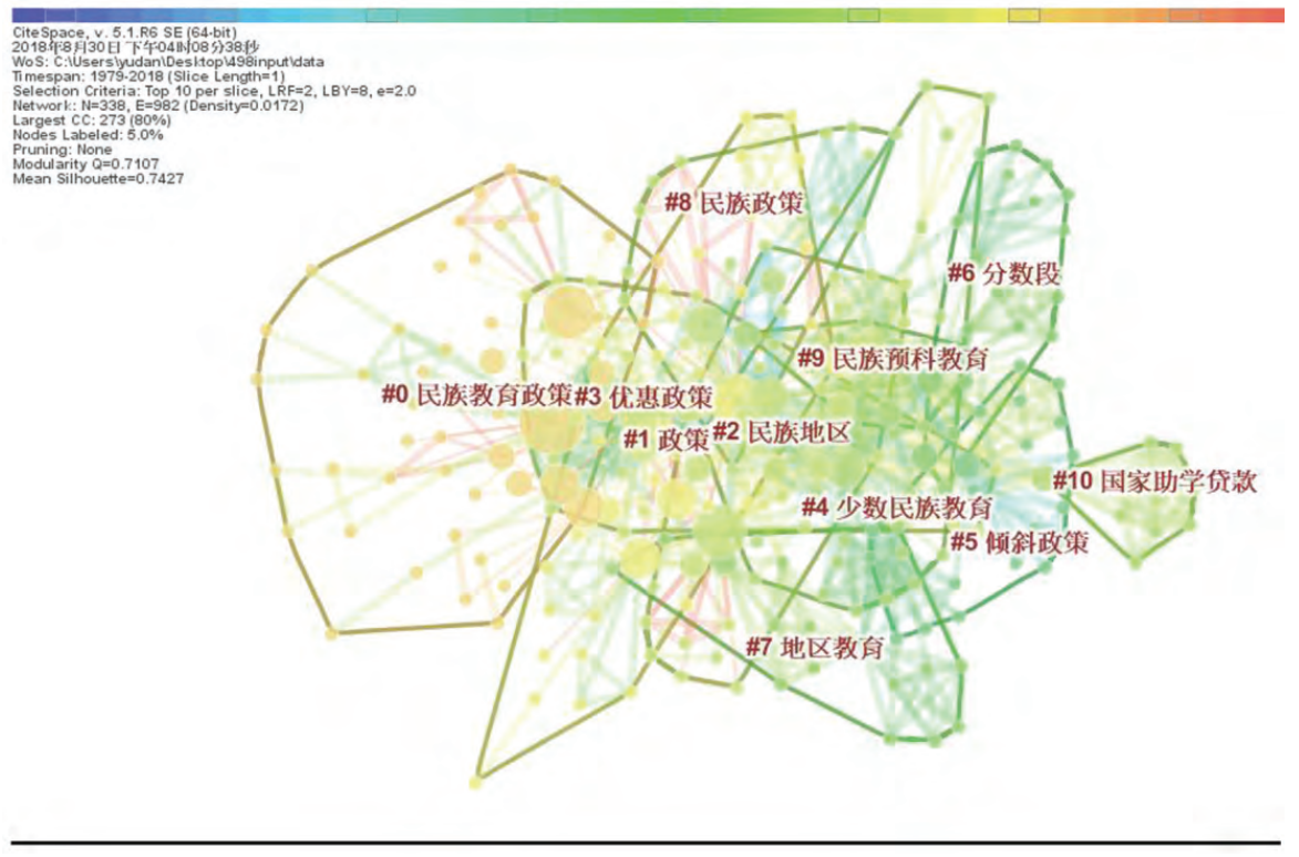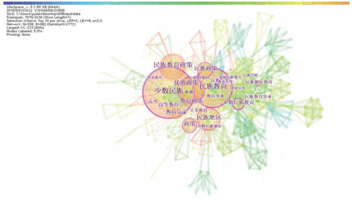 在citespace中,可以对关键词进行共现分析。关键词共现分析能够反映与揭示某一领域当前研究热点及过去曾产生的研究热点是,[1]进而能够迅速把握民族教育政策研究的整体轮廓和特点。