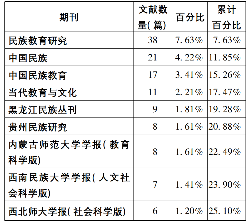 表1是1979—2018年间发表民族教育政策研究文章超过5篇的9份学术期刊。《民族教育研究》共发表文章38篇,占比7.63%,《中国民族》共发表21篇,占比4.22%,《中国民族教育》共发表17篇,占比3.41%。由此可见,民族教育政策研究文章集中发表在较为关注“民族”“教育”的专业期刊上。