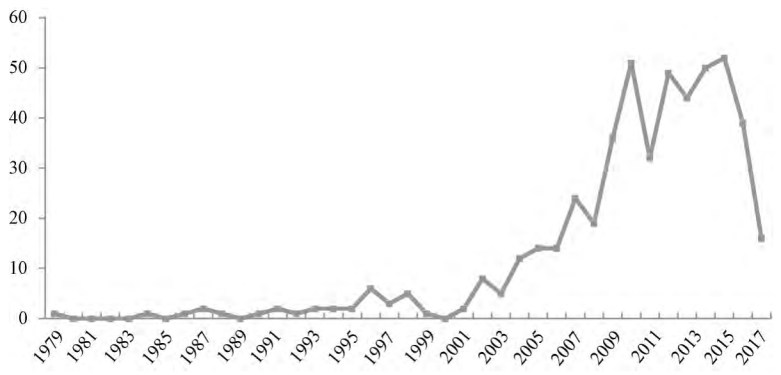 从中可以看到,1979—2018年间,民族教育政策研究的文献数量总体呈上升趋势(2017年数量减少可能是因为知网还没有全部上传2017年发表的文章),从20世纪80年代,每年仅发表1篇、0篇,到21世纪初期文献稳步增长,2015年达到年最大发表量52篇,可以看出,民族教育政策受到我国学者的普遍关注,并且热度持续走高。