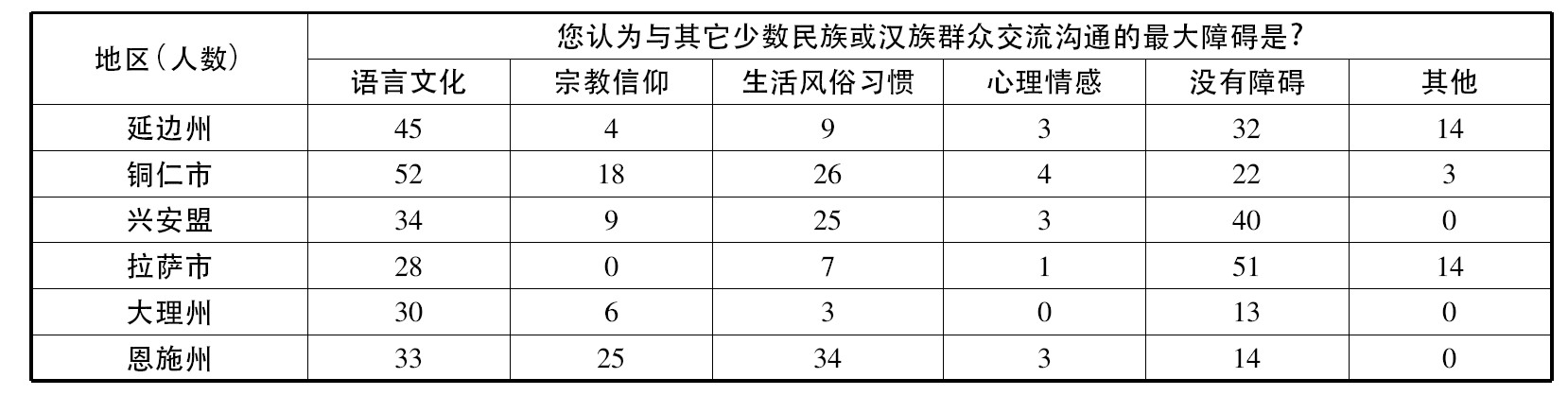 为梳理分析全国民族团结进步创建示范州(地、市、盟)试点地区的文化认同情况,课题组以西藏自治区拉萨市、内蒙古自治区兴安盟、吉林省延边朝鲜族自治州、湖北省恩施土家族苗族自治州、贵州省铜仁市、云南省大理白族自治州六个地区为研究对象,开展了调查研究。