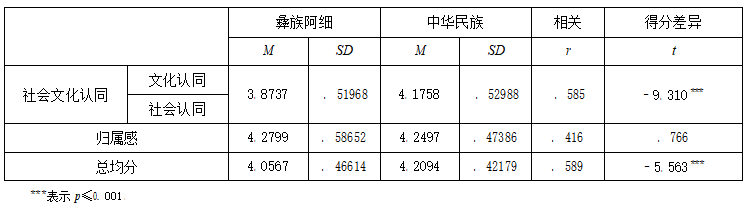 表1 彝族阿细中学生民族认同和国家认同差异比较