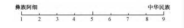 在调查问卷的最后一部分,被试还需要在一个设置有1-9数值的连续坐标(如图1)上判断出“彝族阿细”和“中华民族”在自己心目中的位置,在相应的数字上划“○”,并阐述自己选择该数值的理由。