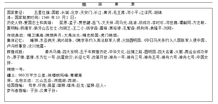 这是一篇典型的获奖作文。从这些获奖的文本中可以看出(见表4),阿细学生的祖国意象与国家象征、国家制度时间、历史人物、爱国志士、传统典故、集体记忆、辉煌成就、疆土、名胜古迹等紧密联系。在文本中,国旗、国歌、长城、天安门、长江、黄河及毛泽东等国家领导人频繁出现,民国以来教科书中不断灌输的英雄人物如岳飞、文天祥、邓世昌、谭嗣同等及现代教科书中不断宣传的钱学森、袁隆平等爱国科学家被反复提及,集体记忆中四大发明、原子弹成功爆炸等辉煌成就和鸦片战争等屈辱历史不断得以强化,珠穆朗玛、青藏高原、西湖、三山五岳、洞庭湖波则延伸了阿细学生对960万平方公里国土的想象。