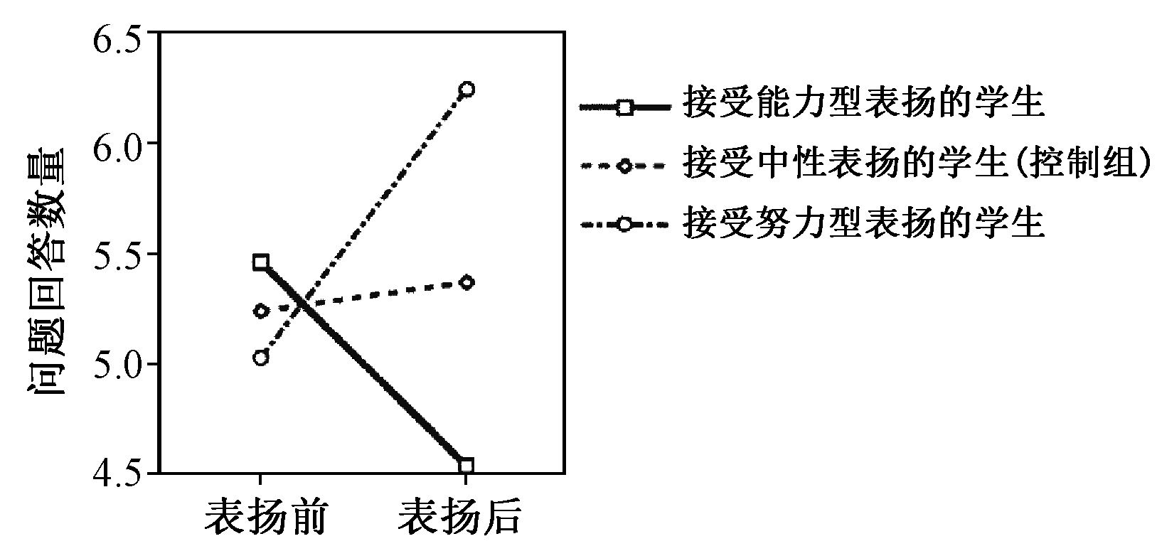 穆勒(Claudia M.Mueller)等学者[20]进一步对比了学生在接受不同类型表扬后的学习表现。选取了128名5年级学生完成一套中等难度的推理问题之后,随机将学生分成三组,第一组给予能力型表扬,第二组给予努力型表扬,第三组作为控制组,给予中性表扬。之后每组再完成另外两套推理问题:第一套推理问题难度非常高,第二套问题难度中等。研究者将对表扬前后的两套中等难度问题的解答率进行对比,发现如图1所示的结果,即不同的表扬方式促进学生不同类型思维倾向的形成。