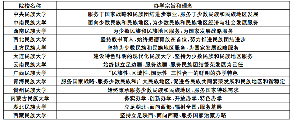表2 13所民族院校的办学宗旨和理念情况一览表