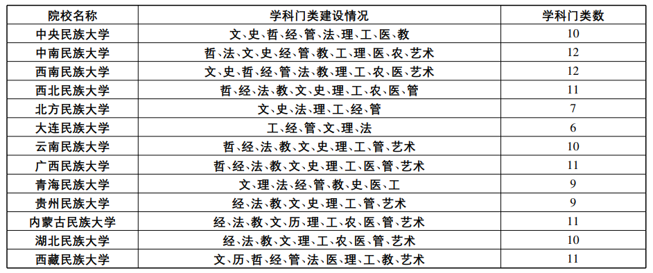 一是民族院校学科门类建设由单一走向多元齐全。起初,民族院校大都以培养少数民族地区发展需要的普通干部为主,辅之培养迫切需要的专业技术干部,[4]并以此办学方针来建构学科和专业。尤其是在20世纪50年代,民族院校学科建设几乎全在文学、法学、历史学等文科门类。到了20世纪60年代,理学门类受关注,数学、物理、化学等学科被纳入,但随着民族地区社会经济发展对民族院校多元高端人才的需求越来越大,单纯某一类学科建设不能适宜其发展和人才需要,学科建设呈现齐全化趋向。20世纪90年代以后,中央民族大学、中南民族大学、西南民族大学、云南民族大学等高校学科设置都涵盖了12个学科门类。