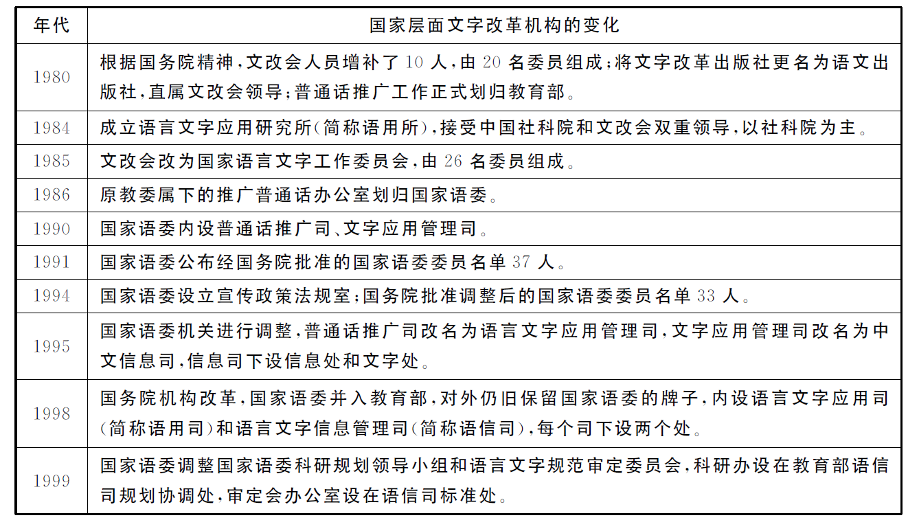 在发展期,我国语言事务治理逐步形成了国家级与省/区/直辖市的两级机构体系。截至1979年,全国已有27个省/区/直辖市成立了文字改革的专门机构、临时领导机构或指定机构,完成中央布置的有关文字改革任务。[6]1984年国务院批准成立语言文字应用研究所。[7]1985年12月文改会经国务院批准更名为国家语言文字工作委员会(简称国家语委)。其主要职责是:贯彻执行国家关于语言文字工作的方针、政策和法令,促进语言文字的规范化、标准化,继续推动文字改革工作,做好相关的社会服务工作。[8]1986年2月原国家教委推广普通话办公室正式划归国家语委。1986年3月《文字改革》杂志更名为《语文建设》,由国家语委主办,成为向社会宣传国家语言文字政策、方针等的刊物。[9]1990年5月国务院批准国家语委正式成立文字应用管理司。[10]1998年国务院机构改革,国家语委由教育部领导,对外仍旧保留语委的牌子,内设语用司和语信司。表1列出了这一时期从文改会到国家语委的机构变迁情况。由此可以看出,从改革开放之初至世纪之交,我国国家层面的语言治理体系在不断探索中逐步完善。