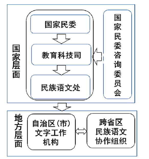 图4描述了我国现有的少数民族语言治理机构体系。在国家层面,隶属国家民委的教育科技司内设有民族语文处,具体负责与少数民族语言相关的事务。同时国家民委咨询委员会是我国少数民族语言文字工作的智囊团,为国家民委献计献策。地方层面既有与国家民委语文工作处对接的区(市)语文工作机构,又有跨省区的民族语文协作机构。这种协作机构能够更好完成单一省区难以完成的任务。需要说明的是,教育部下设了民族教育司,该司还有双语教育处。[22]由此可以看出,国家民委与国家语委、教育部在民族语言文字工作方面有重叠和交叉。