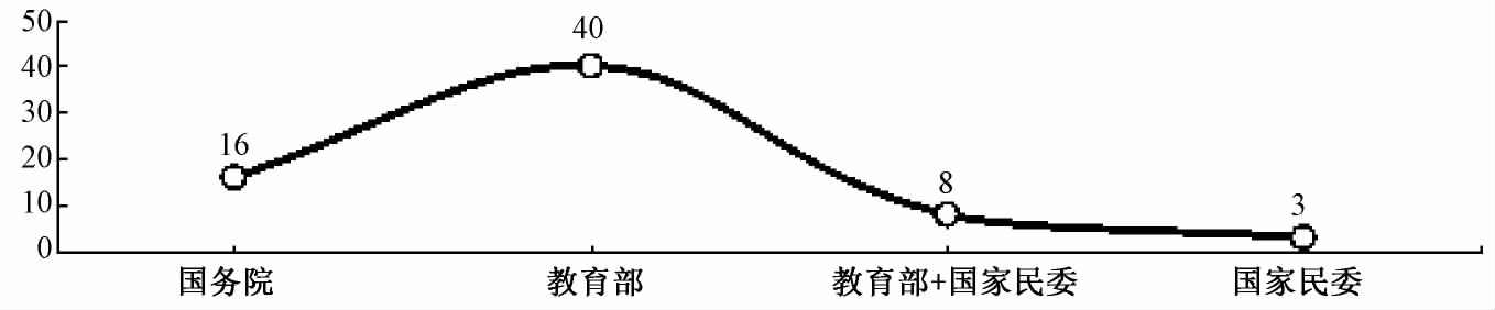 图3显示,我国民族语言教育政策的制定主体主要是国务院和教育部、国家民委等政府部门。70年中,83条民族语言教育政策中的67条由上述主体制定,占比超过81%,教育部参与制定了48条,占比近58%(见图3)。由此可见,我国民族语言教育政策工作多由国家教育主管部门来主导制定、推动实施、监督落实,体现国家意志和代表政府行为。