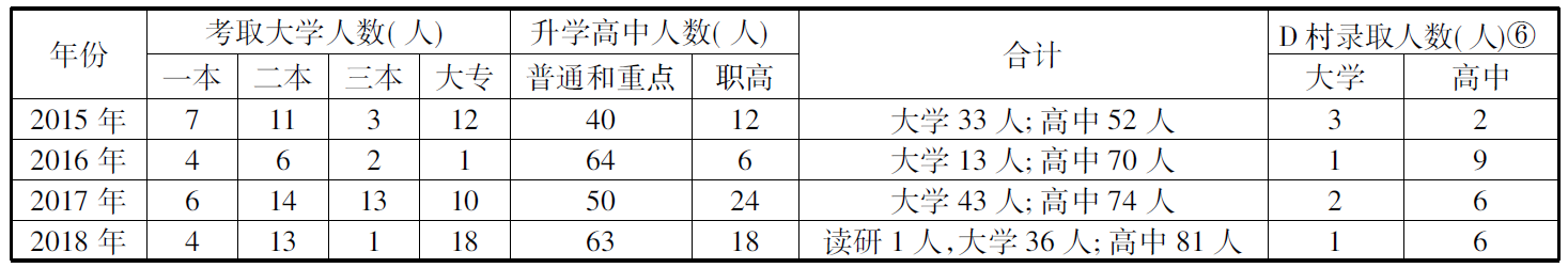 ⑥根据D村主管村干部提供的数据,2019年D村有4人考上大学(其中一本1人,二本2人,大专1人),另有3人考上高中。