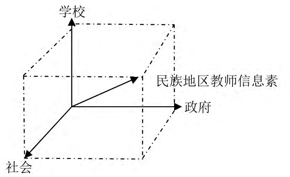 需要注意的是,四种提升模式不是相互对立的,在交互系统内对四种模式的整合能够产生更大的功效。以政府视域为代表的培训模式、以学校视域为代表的师徒制与翻转制模式、以社会视域为代表的智慧型学习模式,在一定程度上是相互影响、相互促进的(如图3所示)。当政府的资金投入与政策支持越大,社会信息资源开放程度与信息安全程度就越大,当学校教师的努力程度与重视程度越大,民族地区教师的信息素养水平就会越高。在学校、政府、社会的交互系统中,缺少任何一方都无法实现教师信息素养的直线式上升,三种力量的最大化才能实现民族地区教师信息素养提升的最大化,四种模式的整合实际上是三种视域的叠加,是为寻找一股合力,只有当学校、政府、社会一致达到坐标轴的最高点时,民族地区教师的信息素养才会直线式上升,并抵达较高点。