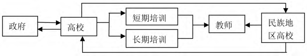 建立提升民族地区教师信息素养的集中培训模式,可以从以下三个环节入手。首先,政府在资金与政策上给予支持,在高校建立培训基地,同时,民族地区学校对教师的信息素养水平进行评价,将教师分为短期培训群体和长期培训群体。其次,高校利用每年的寒暑假期开设培训课程,民族地区教师进行报名与课程选择。最后,高校对参加培训的教师进行结业分析,将有关情况反馈给政府与民族地区学校。政府根据实际情况调整相关政策与规定,学校再依据培训结果对教师进行重新定位,确定下一轮培训的教师(如图1所示)。集中培训模式需要依靠政府、高校与学校共同的力量,利用三位一体的反馈与调节机制,系统提升民族地区教师的信息素养。