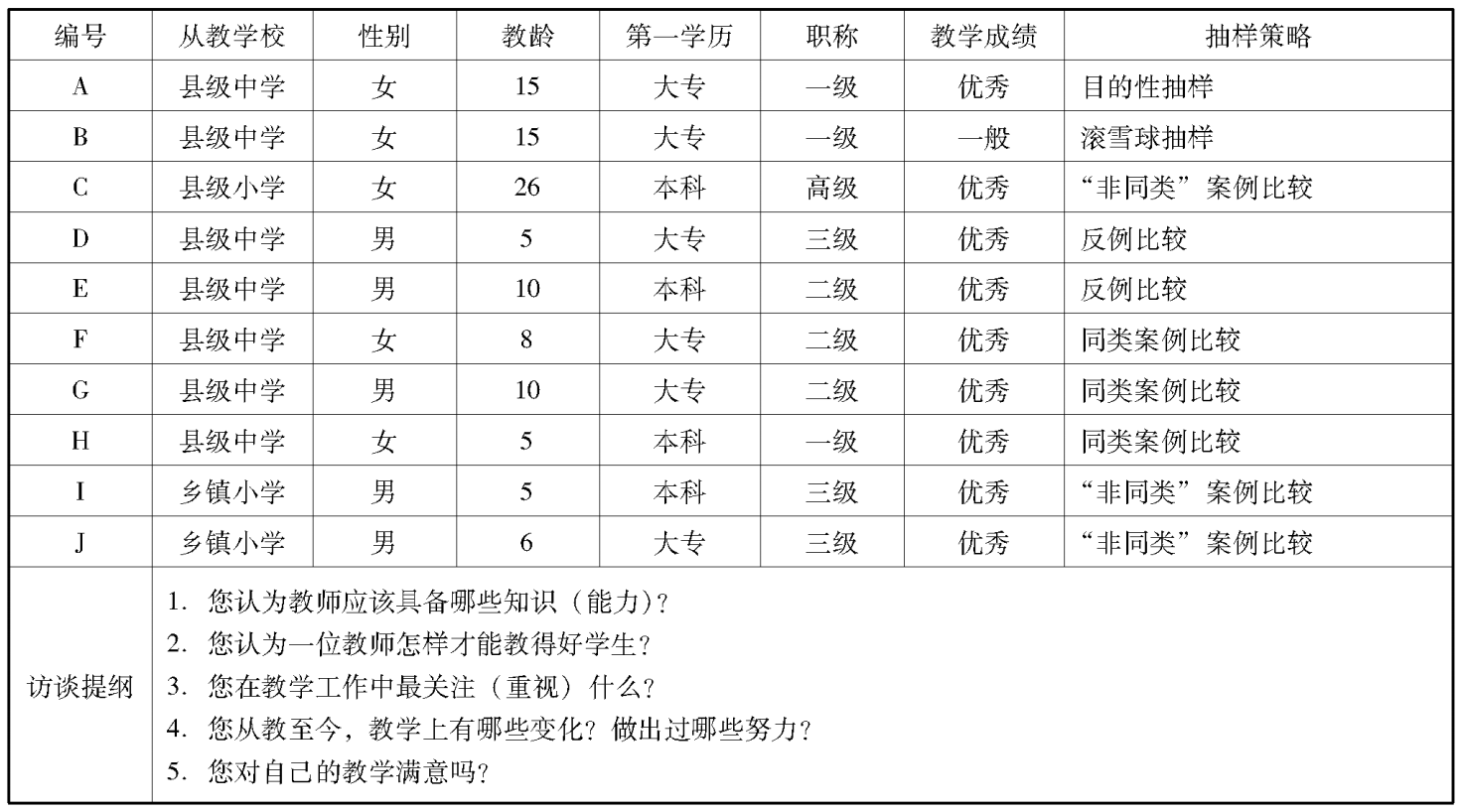 本文中的“少数民族优秀教师”特指以少数民族学生为教学对象的少数民族教师群体中的优秀成员①。在诸多评价教师是否优秀的指标中,教学成绩是最直观、最重要的依据。[17]研究者首先采取目的性抽样策略,在民族地区教学质量较好的民族学校选取了一位教学成绩优秀的教师。在随后的研究中,鉴于多案例分析要求“基于案例群对理论发展的贡献”,[18]“精心筛选6~10个典型案例”,[19]本研究又相继采取滚雪球抽样、反例比较、同类案例比较、“非同类”案例比较等方式抽取了共10个案例(详见表1)。由于案例研究是收集资料、分析资料和形成理论同时演化进行的,具体的抽样策略和案例数据将在研究过程中呈现。