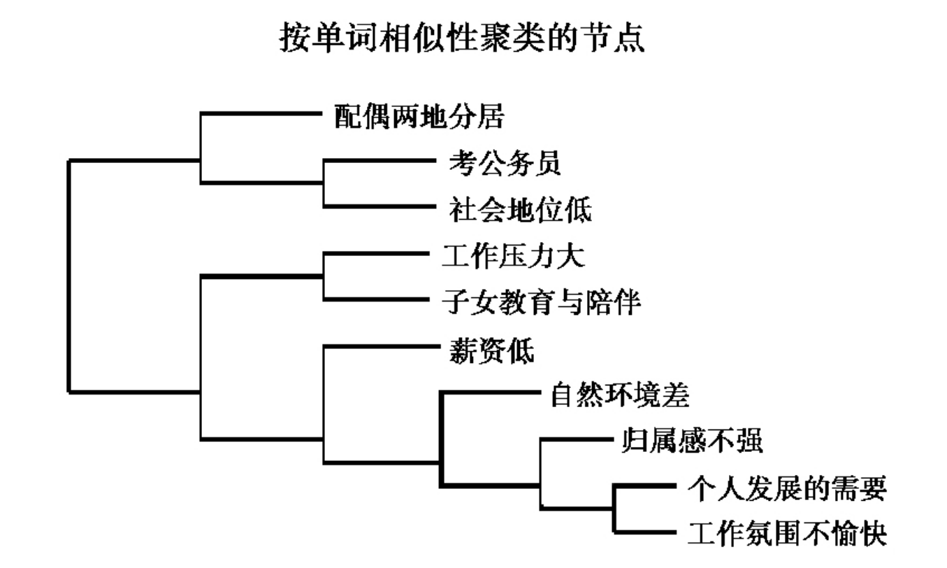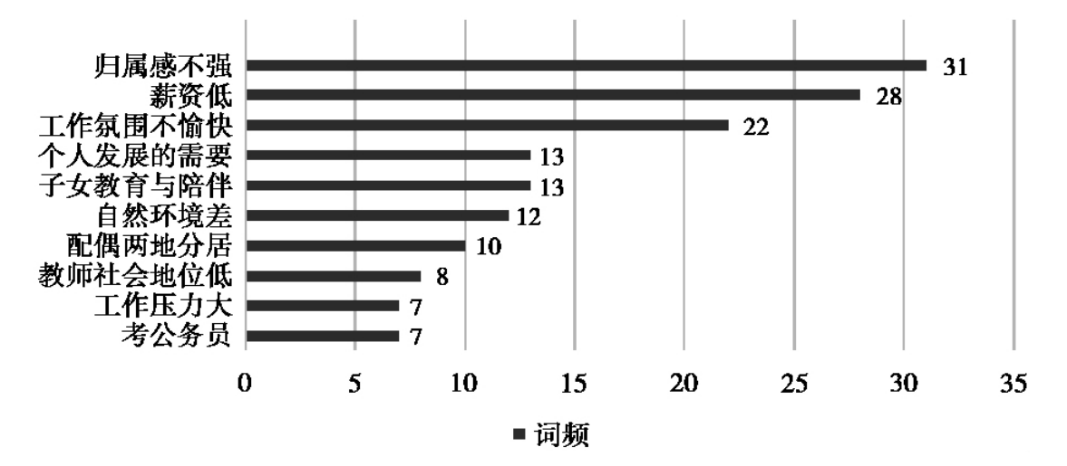 由图1可见,10个主题词在访谈过程中出现的频率有高有低,前五个高频词条依次是:归属感不强、薪资低、工作氛围不愉快、个人发展的需要、子女的教育与陪伴。