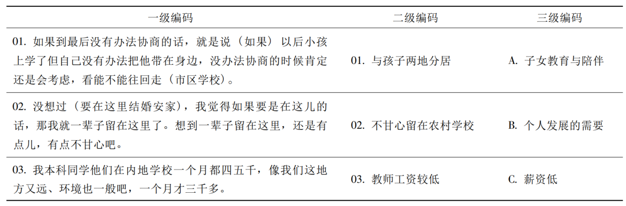 研究运用半结构化访谈的方式对“特岗教师”进行深入访谈,将调研收集的音频资料转录成文本材料,采用陈向明的三级编码形式[6]分析整理文本材料(见表2)。