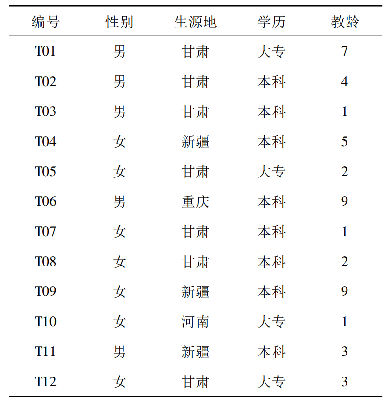 考虑到研究目的和取样的便捷性,本研究对新疆维吾尔自治区阿拉尔市、铁门关市、喀什市的602名农村中小学“特岗教师”进行了问卷调查,对43名“特岗教师”进行了深度访谈,其中表现出离职倾向的有12人,我们将这部分教师称为潜在逃离者(见表1)。