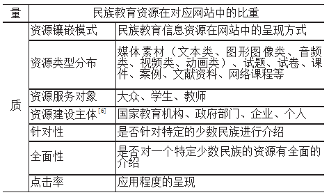该研究主要从资源网站中民族教育信息资源的“质”与“量”两个角度进行,对于质的研究,本文参考张琪[5]等人对基础教育网络教育资源现状分析的7个维度,即资源建设主体、服务对象、资源类型分布、各学科资源分布、教师对资源的认识度、教师对资源建设标准的认识、资金投入,同时针对民族教育信息资源特征对其进行了修改与扩充,具体来说:当前门户网站中专门用于教学的教育资源很少,故不考虑七维度中后四个维度;另外,我国民族教育资源数字化处于起步阶段,为了反映对民族教育资源的重视程度和普遍认识,故增加了新的四个衡量标准:网站中资源的镶嵌模式、全面性、针对性、点击率。总结下来,具体维度如表2所示: