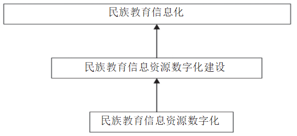 通过文献调查和实证考察,我们发现,在民族教育信息化建设中,大多是对多元文化资源与主流文化教育资源的远程利用,将发达地区的优质教育资源运用到民族教育中,却忽视了少数民族所特有的优质教育资源和相关民族属性。故而在民族教育信息化建设进程中,应挖掘少数民族独有的信息资源对其进行数字化建设。需要明确指出的便是,民族教育信息资源数字化建设是以民族教育信息资源数字化为核心的一项系统性强、涉及面广的庞大工程。我们不能将其与民族教育信息资源数字化等同起来,如果说民族教育信息资源数字化是一个将传统的民族教育信息资源转化为数字信息资源的过程,那么民族教育信息资源数字化建设还应该包括这一过程中涉及的方针、体系、法律、政策等问题。综上所述,可以得出关系结构,如下图所示: