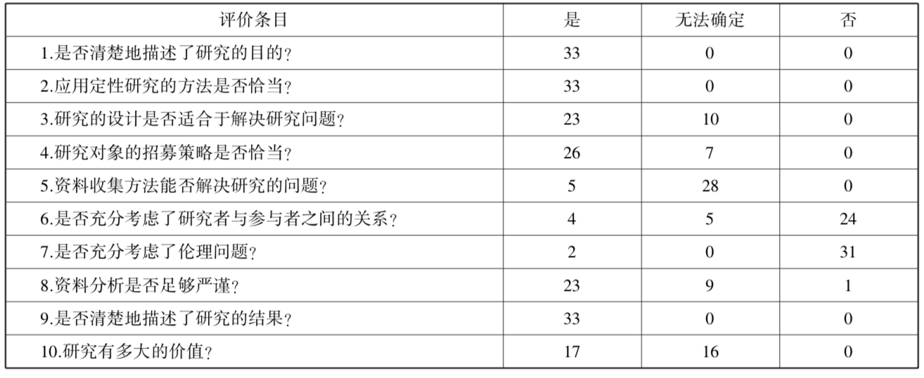 第二,在质量评价中发现,多数成果在资料收集、研究者反思和伦理学三个问题上可能存在较高的研究风险偏倚。主要表现为没有详细描述研究方法和资料、数据、案例的收集是怎样进行的,没有审视研究者自己对结果的潜在影响或根据研究情况适时修订研究步骤,没有详细描述被调查者知情同意的过程,因而在一定程度上影响了成果的研究价值。这种情况的出现与相关学科的文献写作方式、期刊的发文限制有一定关系,今后应引起研究者的重视,不断完善研究的规范性。另外,部分文献因研究对象为某一所高校或某一个学院,综合考虑给予了研究价值“无法确定”的评价,故在一定程度上影响了所纳入文献研究价值评价的总体情况。