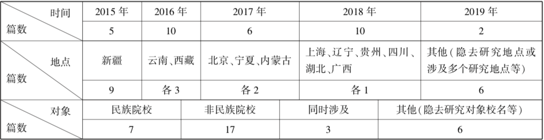 第三,在资料提取中发现,绝大多数成果的研究地点及对象是西部地区院校(特别是新疆)和民族院校。这反映了当前高校民族团结教育的实践与研究仍主要针对的是少数民族如何团结好汉族,而在一定程度上忽视了汉族如何团结好少数民族、少数民族之间如何相互团结好[9]。尽管所纳入的部分文献开展了不同地区、不同院校、不同民族的比较研究,但数量较少,研究结果的价值还不够显著。所以,在不同的高校和大学生中探讨民族团结教育的影响因素,总结各类型高校民族团结教育的实践经验并进行比较,是深化高校民族团结教育研究的一个重要方向。另外,定量研究的不足导致对一些常见问题缺少证据支撑,如年级、专业、性别、籍贯、族别等因素与民族团结课程、活动的相关性到底如何等等。因此,开展对具体办法措施的实证研究是深化高校民族团结教育研究的另一个重要方向。
