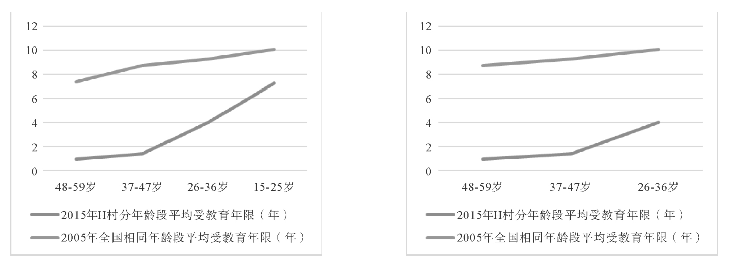 图1 H村与全国分年龄段受教育水平的差异 图2 全国相同年龄段数据平移后受教育年限对比