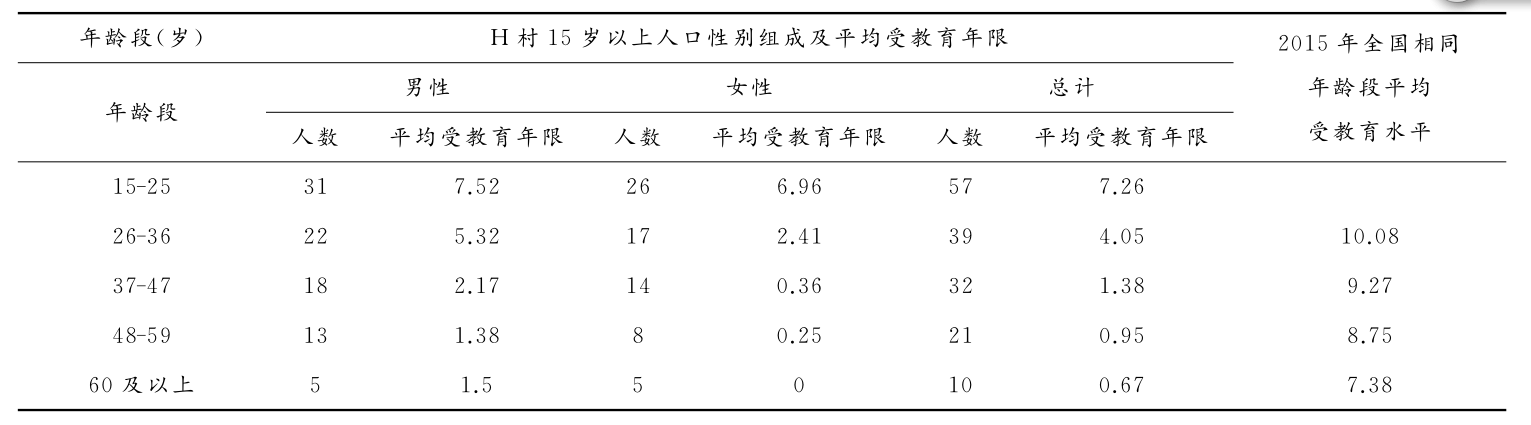 表1 H村15岁以上不同年龄段人口平均受教育年限