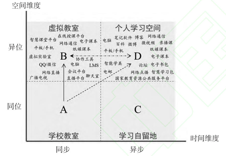 从空间、时间两个维度来看,学习生态环境全盖四种类型:同位同步型(A)、同位异步型(C)、异位同步型(B)、异位异步型(D)。它们典型的环境范式分别为学校教室、学习自留地(如图书馆、阅览室、自习室、学习中心)、虚拟教室、个人学习空间。如图1所示,开展异位散布式学习需要学习环境由A型环境向B、D两型环境转移。