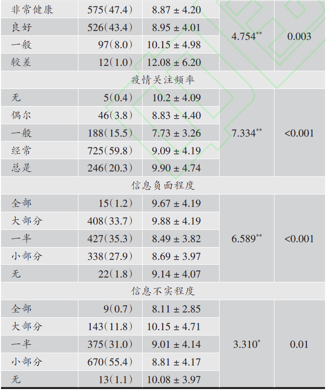 问卷内容包括一般资料和GAD-7广泛焦虑障碍量表(7-item Generalized Anxiety Disorder scale),一般资料包括性别、年龄、婚姻状况、学历、工作所在地、身体状况、疫情关注频率、信息负面程度及信息不实程度等。GAD-7广泛焦虑障碍量表是2006年由Spitzer[7]等开发的7个症状条目的广泛性焦虑量表,其信效度较好,Cronbach's a系数是0.90,重测信度系数为0.76。量表每个条目按照0-3四级评分,总分21分,分数越高,自我感知焦虑程度越高。根据焦虑评分总分,分为四个焦虑等级:0-4分为无焦虑;4-9分为轻度焦虑;10-14分为中度焦虑;15-21分为重度焦虑。
