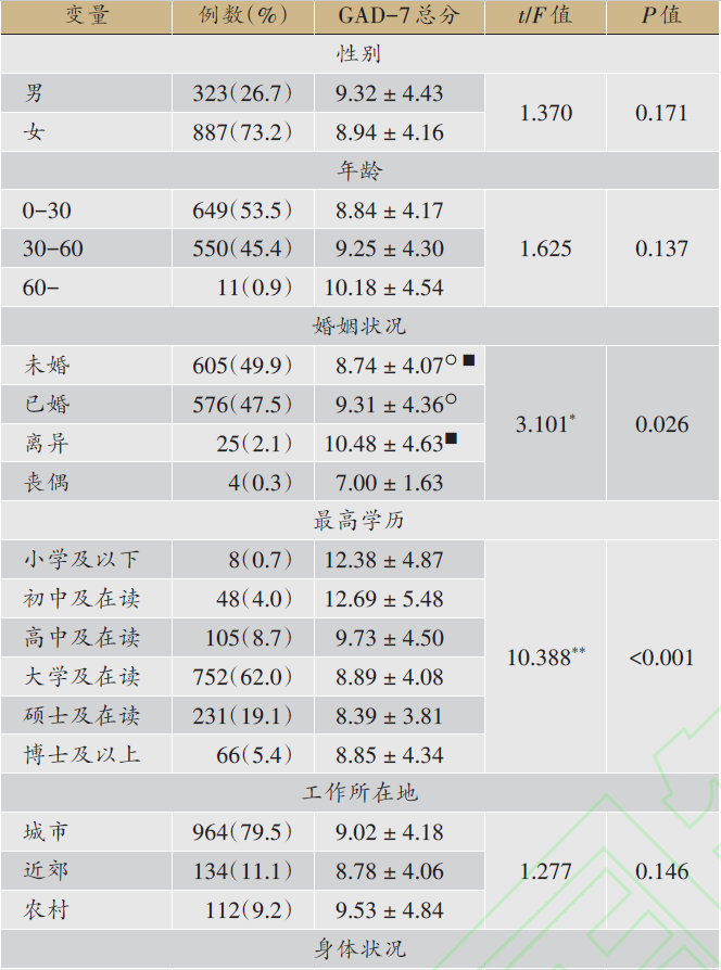 注:○表示未婚与已婚的GAD-7评分有统计学差异,P=0.02,■表示未婚与离异的GAD-7评分有统计学差异,P=0.043,*P<0 .05,**P<0 .01。