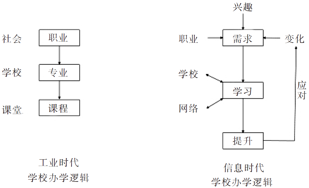 今天学校办学的出发点已经有了巨大的转变,从为社会培养专门人才,变成为学习者个人提供自我提升的教育教学服务。由于社会变化越来越快,职业的划分也在不断改变,传统职业之间的边界日益模糊,学习者的学习需求也越来越多元和个性化,学习的途径与方法也越来越多,对学校变革的要求也越来越迫切。今天学校的办学逻辑已经与传统的工业时代大相径庭了。如图2所示。