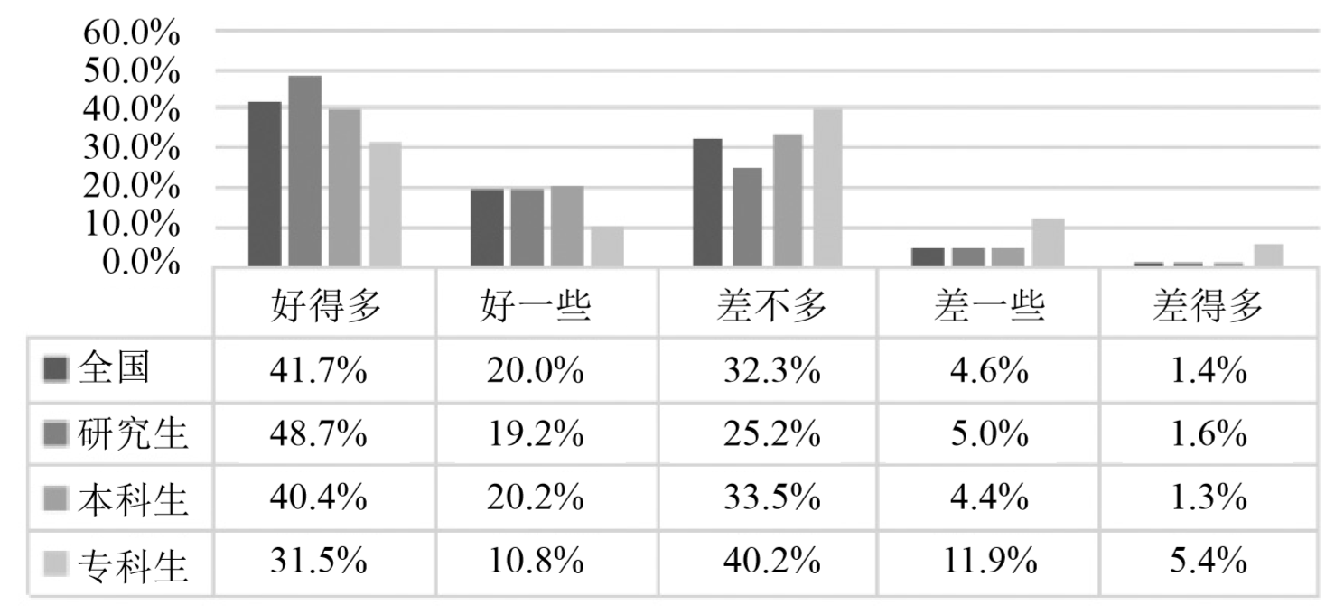 (5)积极重建内心与生活秩序。重新夺回对时间和生活掌控权,是抗击疫情的“情绪稳定剂”。随着疫情的有效防控,61.7%的大学生心态和情绪比疫情刚开始暴发时变好,只有6%的大学生情绪变差(见图2)。大部分学生能积极调整认知、调节情绪,适当转移注意力,改变人际交往模式,建立家庭心理联结,积极重建疫情下的生活秩序,重新回归理性与稳定。研究生受学历、年龄、社会经验、人生阅历等影响,情绪较本科及以下大学生更稳定,而专科生的心理韧性最弱。