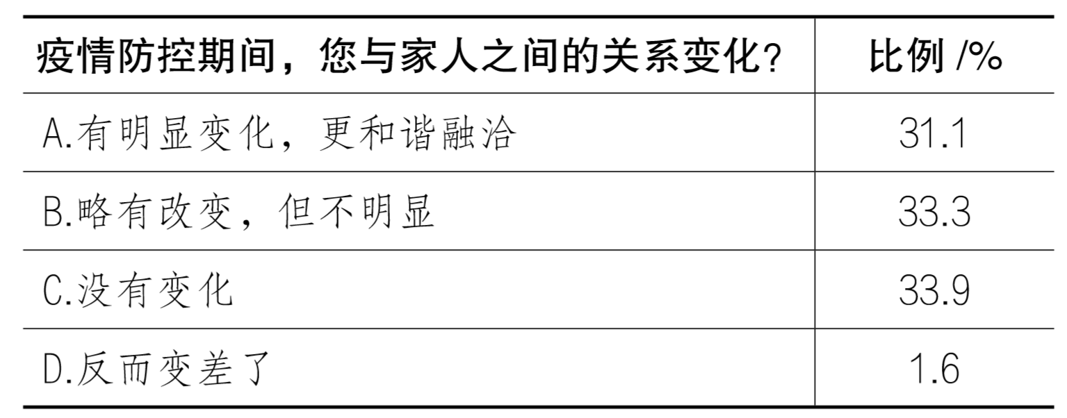 (4)真情陪伴父母,建构和睦家庭关系。在疫情防控期间,青年大学生“被动”回归家庭,93.4%的大学生能够做到自觉安心陪伴父母及家人。家人互动内容方面,选择与家人一起做家务和休闲娱乐的比例最高,分别占比82.6%和76.0%,一起交心谈心占比60.9%。疫情面前,一家人朝夕相处有助于构建更为和睦的家庭关系,31.1%的大学生表示家庭关系比疫情之前明显更和谐了,有1.6%的大学生表示家庭关系变差了(见表5)。