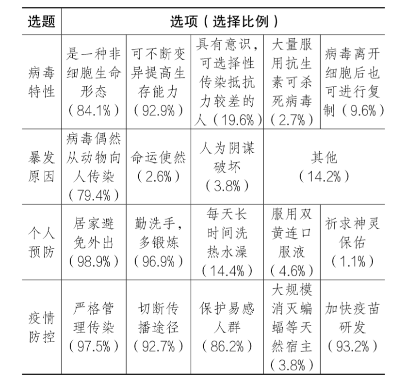 (1)对疫情认知总体科学理性,部分大学生存在认知偏差。调研显示,大多数大学生能科学理性认识病毒的基本特性、暴发原因、个人预防及国家防控措施,少数大学生存在认知偏差(见表1)。值得警惕的是,在疫情暴发原因的选择上,仍有个别大学生对网络上出现的“天命谴”或“阴谋论”表示认同,占比分别为2.6%、3.8%。统计还显示,人文社科类学生对疫情认知偏差比例高于理工科类学生,尤其体现在对病毒常识的认知上,如有23.6%人文社科学生不知道“病毒是一种非细胞生命形态”,而理工科类学生不知道的比例为9.99%。