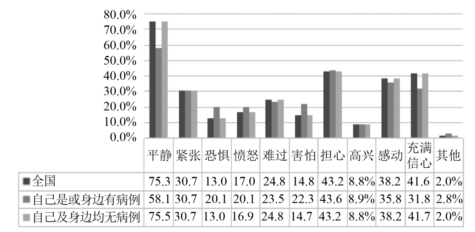 (1)大学生情绪总体上平静稳定。稳定的情绪、平和的心态,是抗击疫情的“心理口罩”。在疫情之下,75.3%的大学生情绪平静,41.6%的大学生对疫情防控充满信心,38.2%的大学生表示感动,这是疫情防控的重要思想基础(见图1)。疫情之下,原有的生活方式极大改变,带来一定的应激反应。访谈中,很多学生都表示疫情刚暴发时,体验到较为强烈的负性情绪,如紧张、恐惧、愤怒、难过、害怕、担心等,但在党中央的坚强防控之下,疫情得到有效控制,情绪也逐渐趋于稳定。受对疫情传播途径等认知的影响,自己是疑似、确诊病例,或者身边有疑似、确诊病例的大学生,反映出比其他大学生更明显的害怕、恐惧和愤怒情绪。